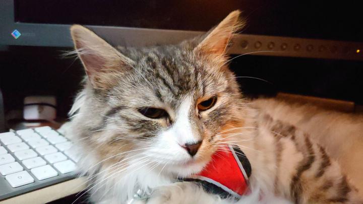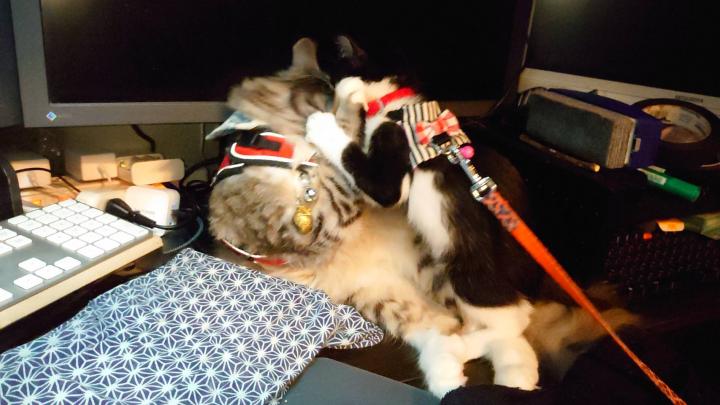 クレアが筆者のデスクでまったりするも、リード付きで追いかけてきて自力でデスクに乗り、襲いかかる。