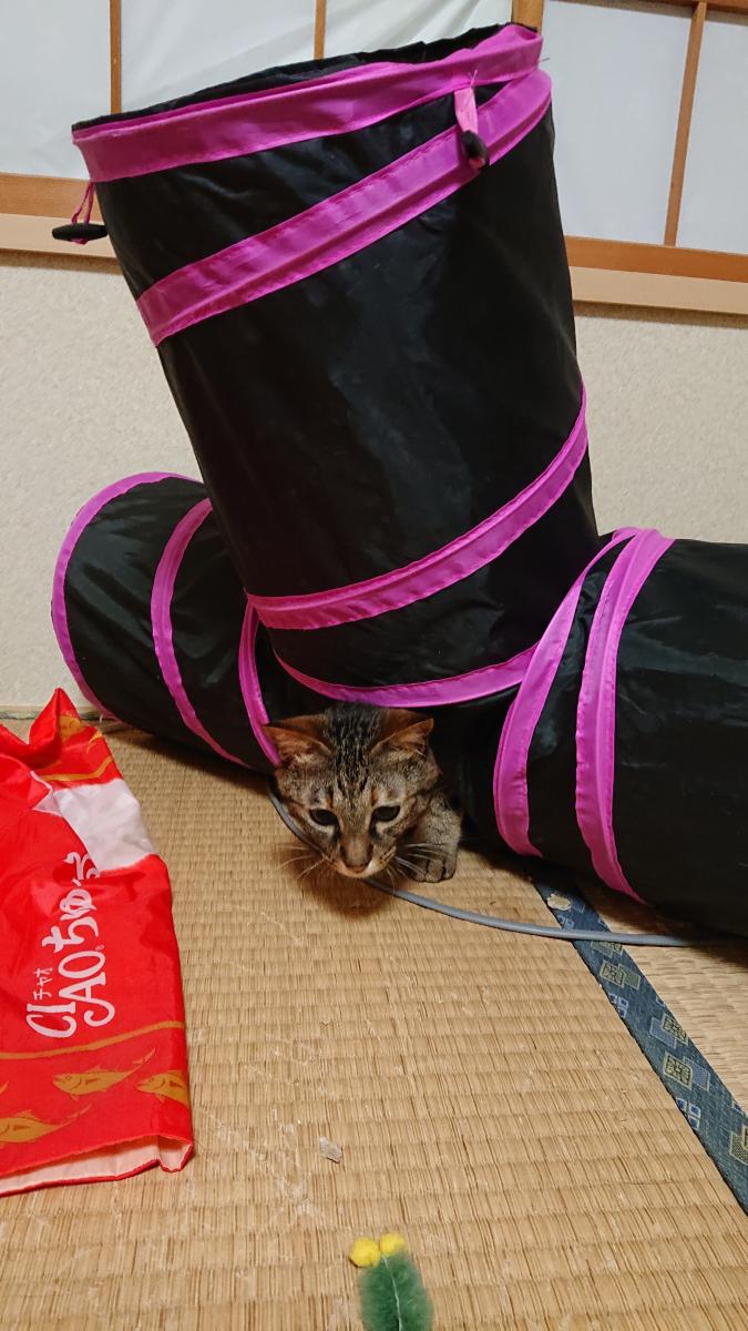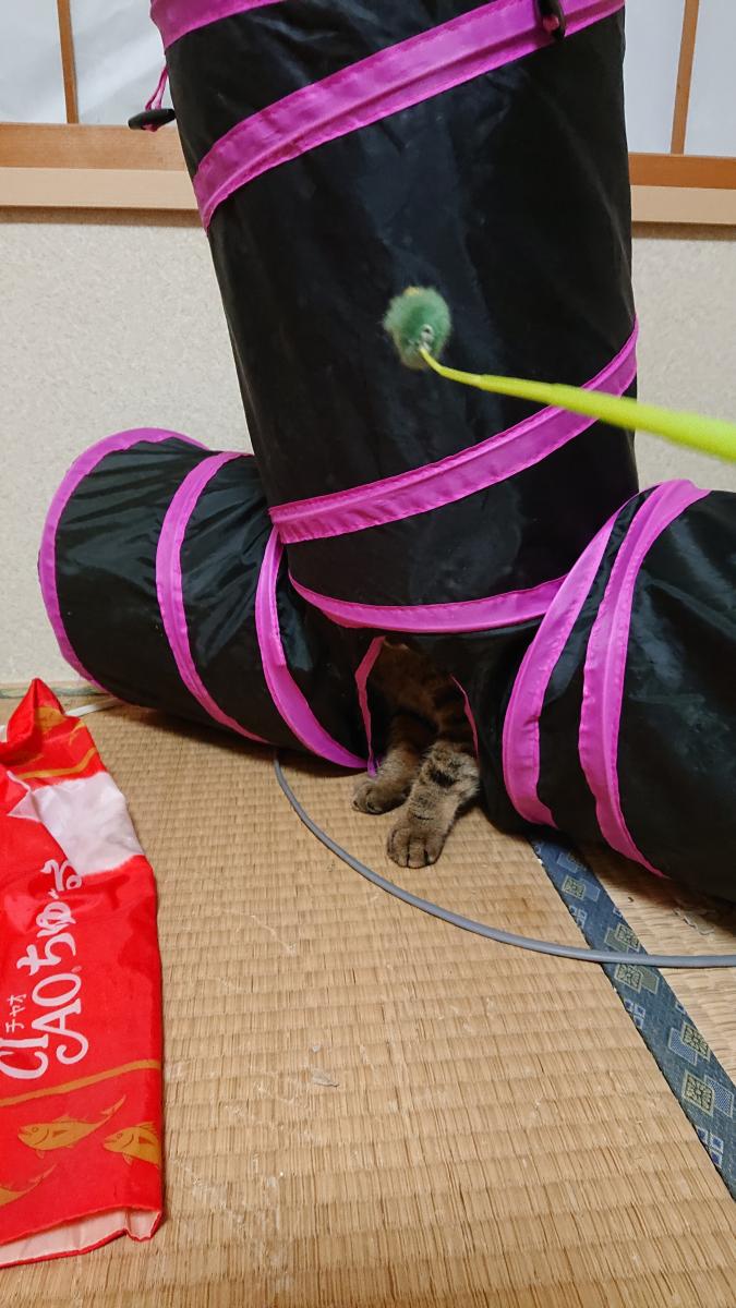 りんちゃんとじゃらし遊び。トンネルから出たり入ったり。