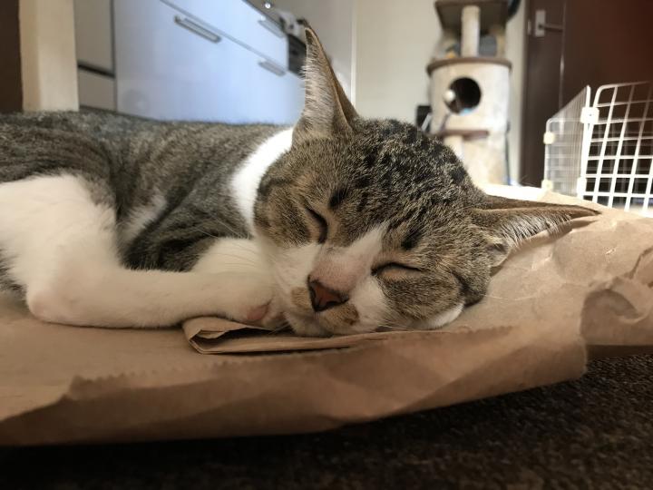 紙袋も大好きでぼろぼろなってもすてれません😅元気に楽しく過ごせますように😆因みにカルカンパウチ沢山食べてご満悦でした😆
