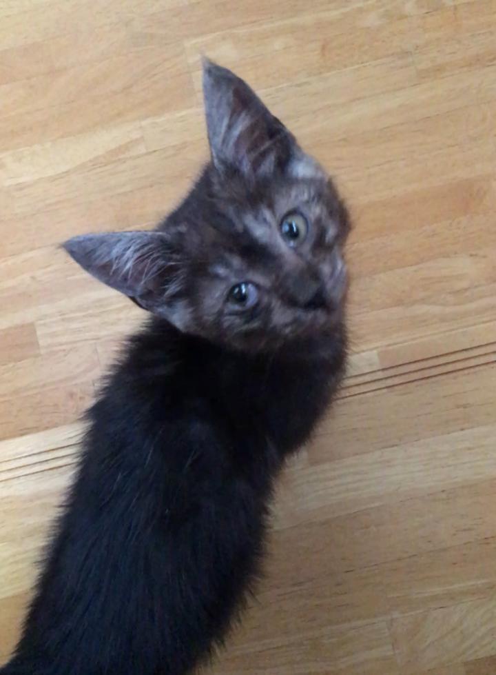 なんと昨日、職場で、また別の2匹の声が聞こえたそうで、そのうちの1匹を会社の方が協力しあって捕獲したそうです。今度はおチビちゃんと同じくらいの大きさの、キジトラの女の子。会社の方がすぐに家族に迎えてくださいました。