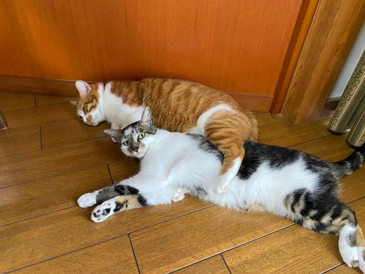 それぞれが好きな所でまったりしていても、誰かが「お腹空いたニャ〜」と近づいてくると、他の2匹も直ぐに現れます。たとえ2階にいてもです。 ほんと不思議です。