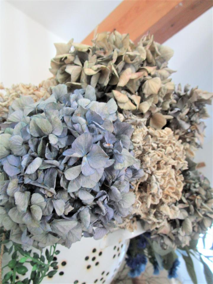 水色系アジサイは、2束ほぐして、他の半端なコとぜーんぶ合わせた。 スクちゃんにやられちゃうので、結局高いトコへ。