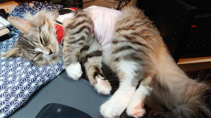 早速、術後ウエアを着させてカラーは取り、食べやすいご飯を与えて、みたいな流れだった。