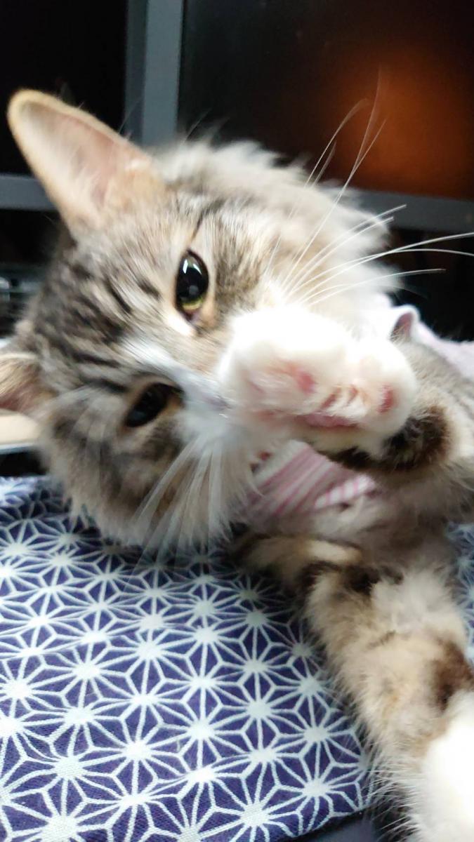 下痢のお尻を舐めた後、筆者に懸命にグルーミングしてくれる。