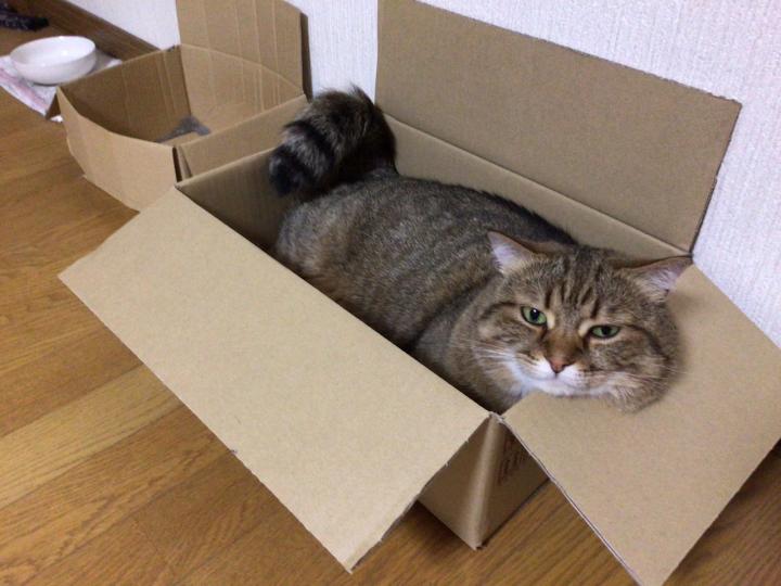 新しい段ボールの寝床だにゃ。どやにゃ。