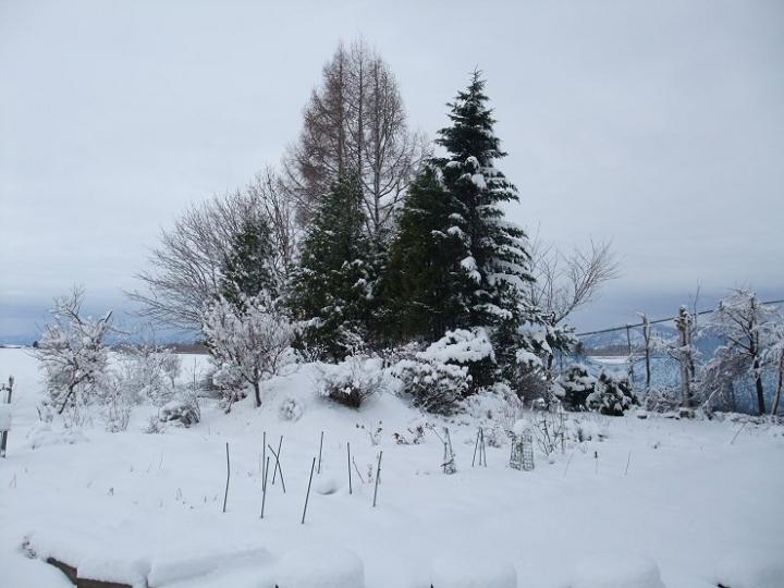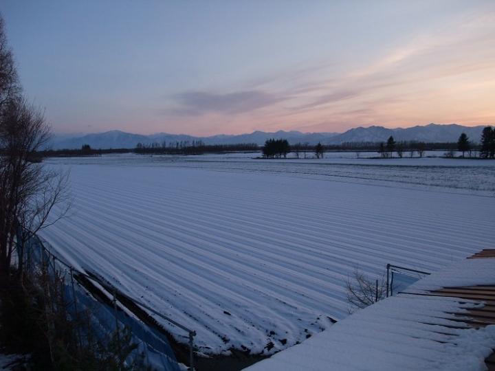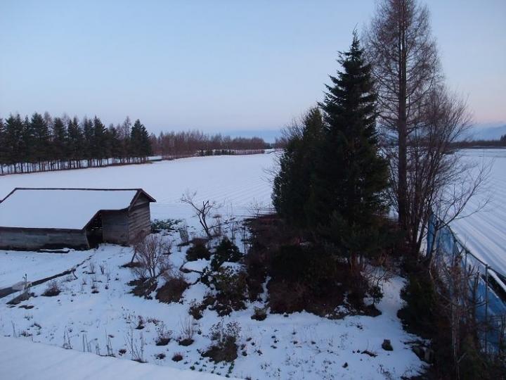 因みに庭のすぐ裏はじゃが芋を植えた畑で、奥の少し融けかかっている所は小麦畑です。