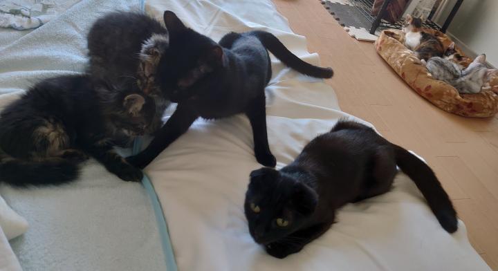 黒猫と黒スコティッシュを里親として、足長マンチカンと短足マンチカンをペットショップで一目惚れで家族にお迎えしました。ペットOKのアパートに引越し審査も猫ちゃんで通してもらっています。