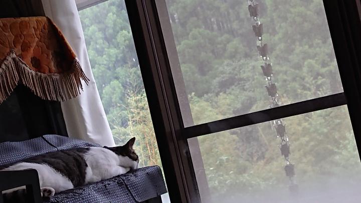 夕べはお姉ちゃんと一緒に(o_ _)oしたリンちゃん。朝早く起きて外を眺めていたけれど相変わらずの雨。ここ数日変わらない外の景色を眺めながらやっぱりフラストレーションがたまってしまうリンちゃんでした。