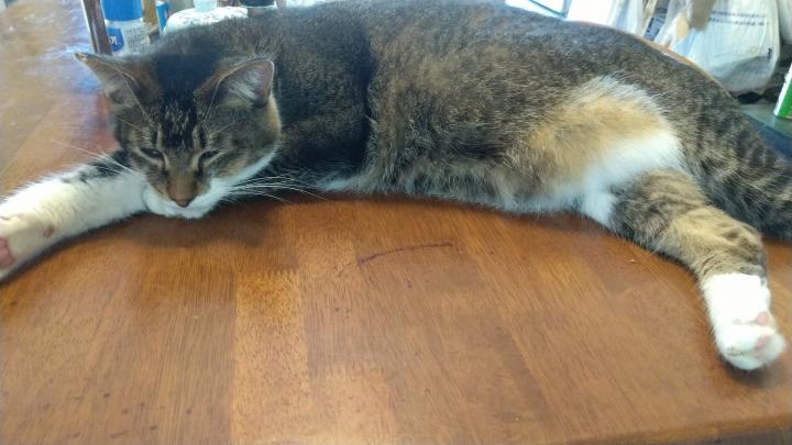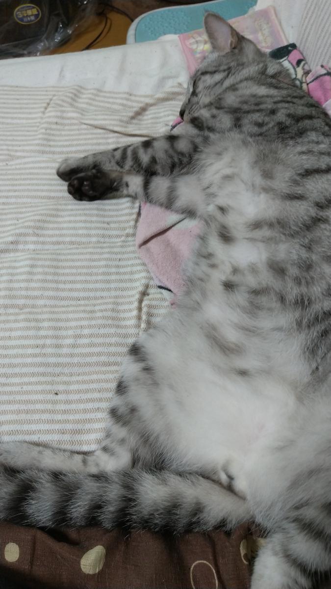 開きになって寝てるにゃ(゜)#))<<