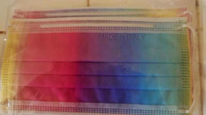 オサレなレインボーカラーの不織布マスク…Made in Italyの文字が見えますが、さ~て?!(笑)