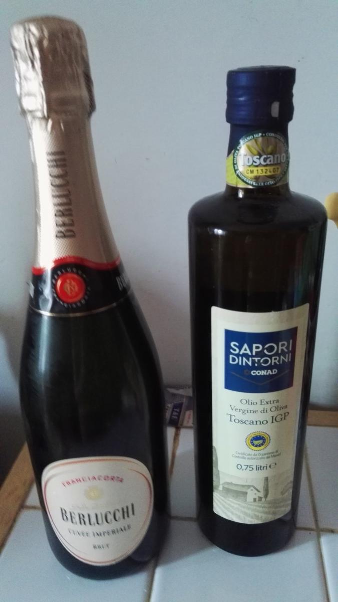 待機受け入れ先への気持ちだけのお土産の一部…私好みのシュワシュワワインと、トスカーナのオイル(^q^)