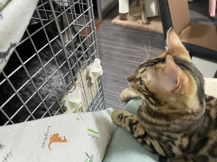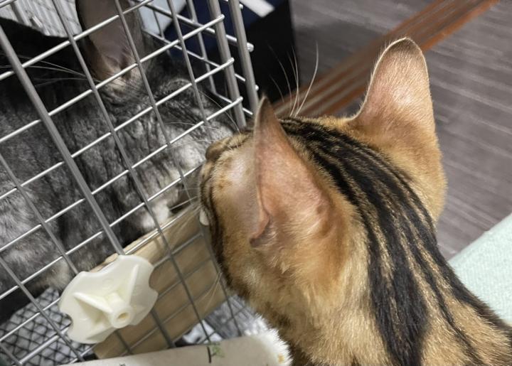 元々飼っていたメルちゃん(チンチラ)が旅立ってしまい寂しそうなギンちゃん(ベンガル)を見ていられず、思い切って保護猫ちゃんを迎え入れました。