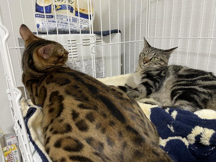と思いきやよく見たらギンちゃんはサジちゃんをペロペロ。でもサジちゃんは嫌がって猫パンチ!!びっくりしたギンちゃんはサジちゃんの首元をガブリ😰
