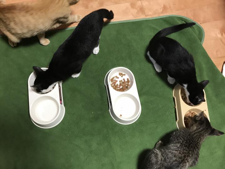きーちゃんがみーちゃんに猫パンチする可能性があるので、この真ん中に私が座って食べ終わるまで監視。