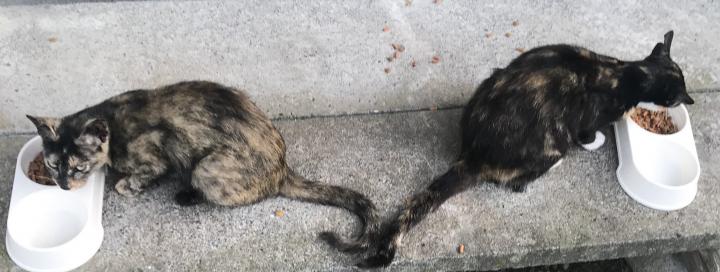 これはおそらくトラちゃんに餌をやる時にみーちゃんときーちゃんがトラちゃんの餌を取らないようにみーちゃんときーちゃんにも(餌与え終わってても)餌をあげてトラちゃんの方に行かないようにしてるからだなーと。