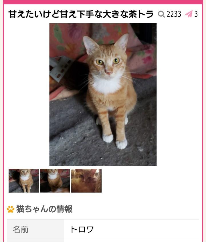 前のにゃんこが死んじゃって傷心の私は、あの日里親募集のページに載っているトロさんの写真を見て、なぜか猛烈にこの猫が飼いたい!と思ったのよ。要するに一目惚れよ。