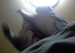 パパの背中から、天井灯のひもにじゃれる漢ちゃん百ちゃんです。