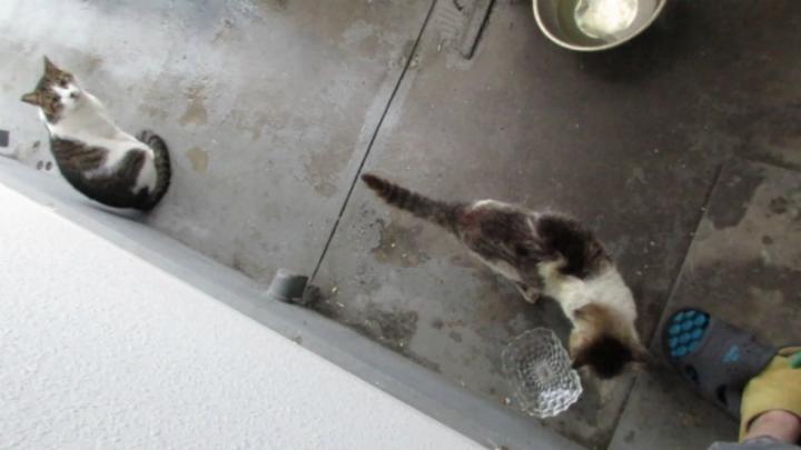 どうしても帰らないので少しご飯をあげます 右の猫がゆめちゃんでその子が食べに来ます