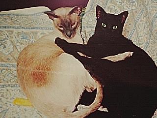 シャムとオリエンタルショートヘアー(シャムのポイントカラーじゃない方(黒))ですね。