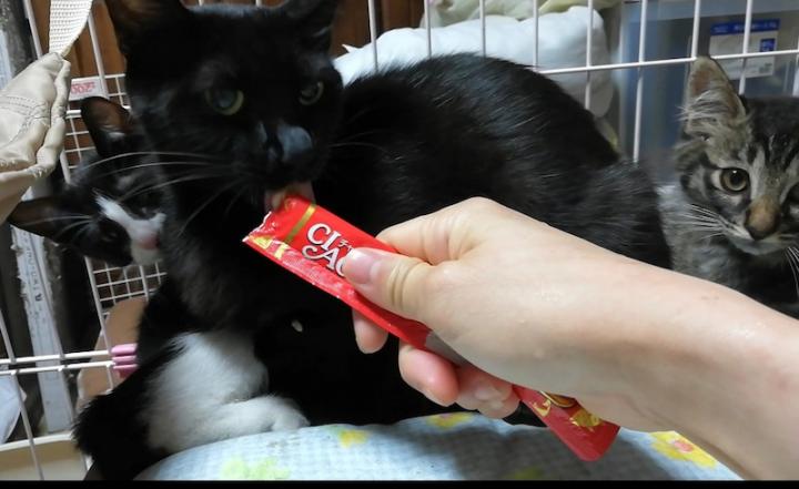 母猫は身体は触らせてくれなかったけど保護当日から手からちゅーるを食べました。