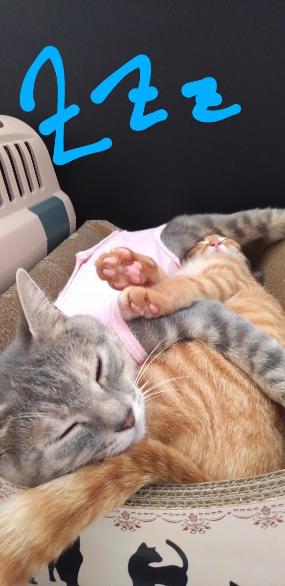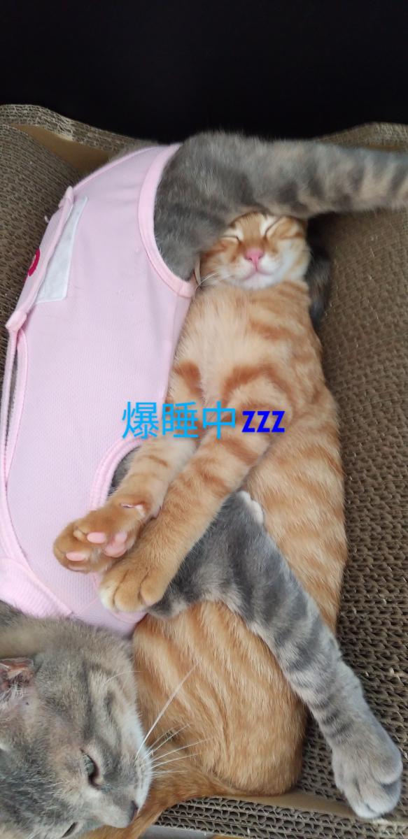 午前中は先住猫のもんちゃん(こちらも元野良猫)と部屋中走り回ってたので疲れたんでしょうね😄