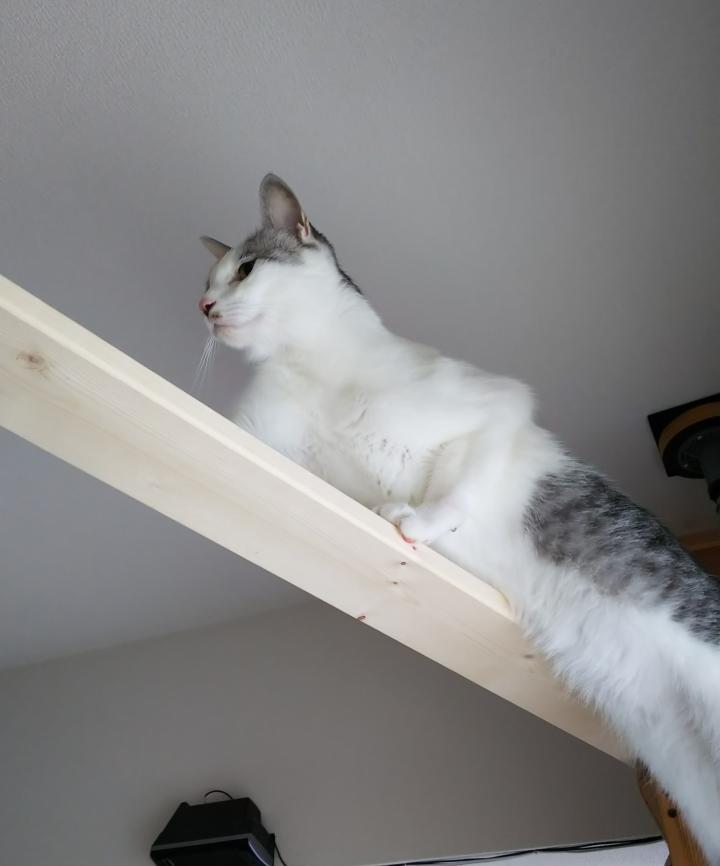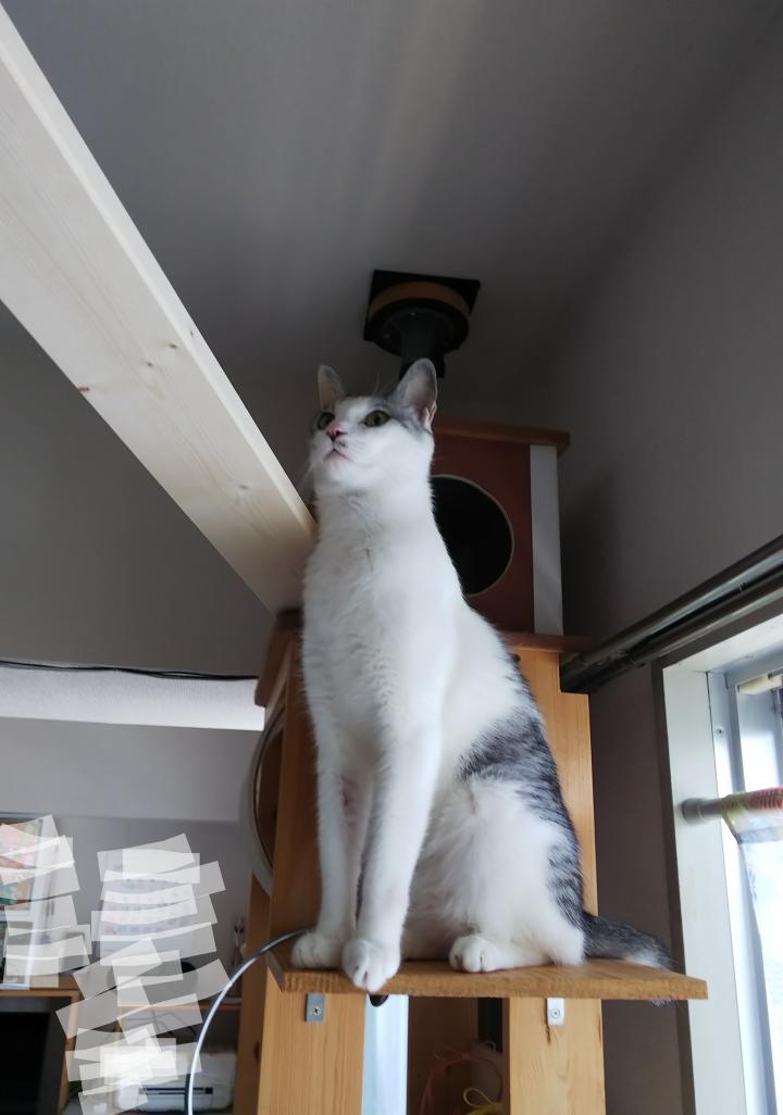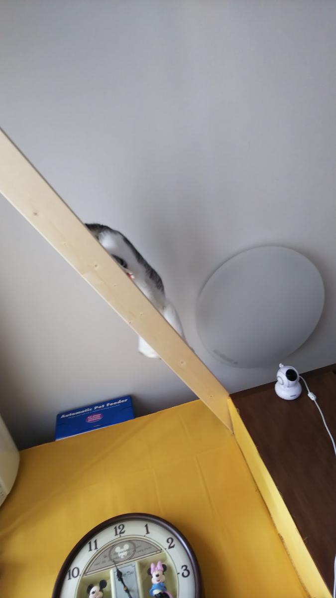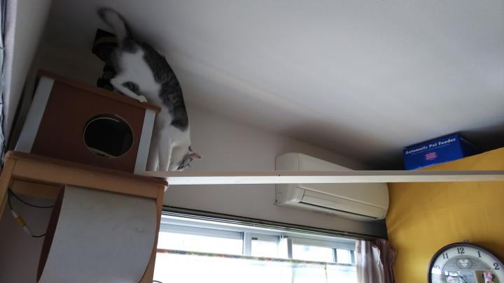 なかなかいい場所がないので、キャットタワーから食器棚迄。