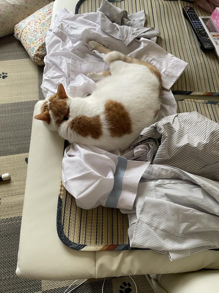 退かないので、ズリズリ体の下の服を引っ張り出して1枚はなんとか。