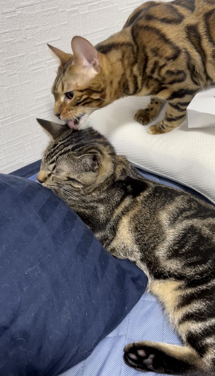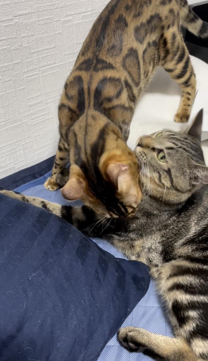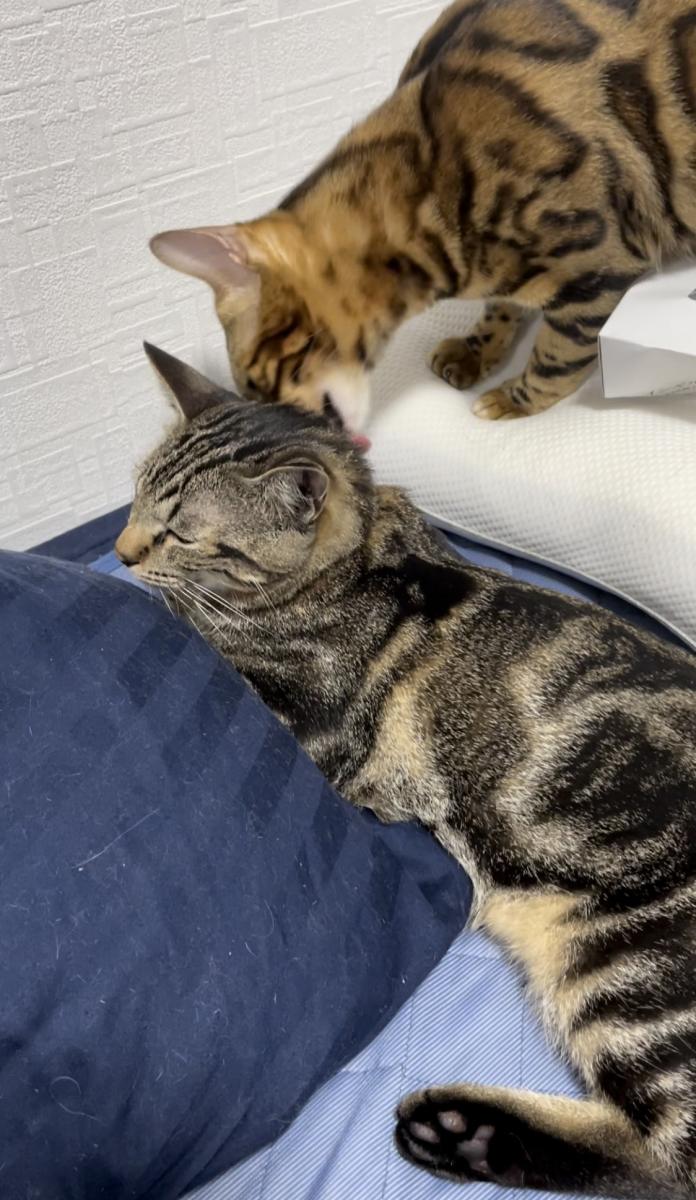 オスはあんまり兄弟以外の猫をグルーミングしないと聞いたことがあるのですが、出会って1週間でペロペロしちゃうぎんちゃんはオネェなのかコミュ力高すぎるのか。。。