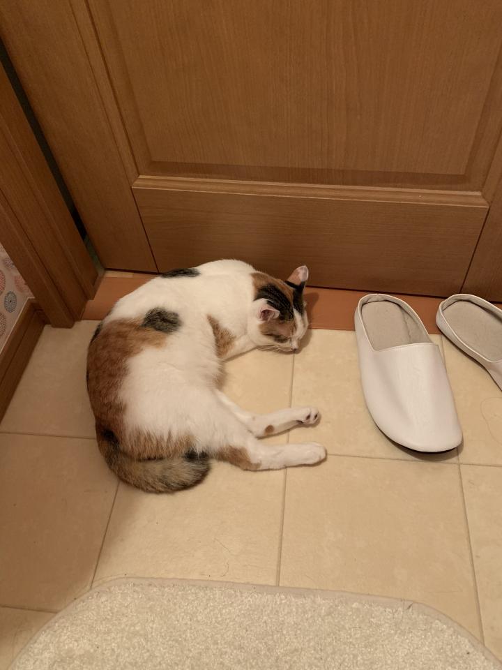 しばらく抱っこしてたけど、もう腕が限界で下に下ろすと、トイレの床でそのまま寝ちゃいました。