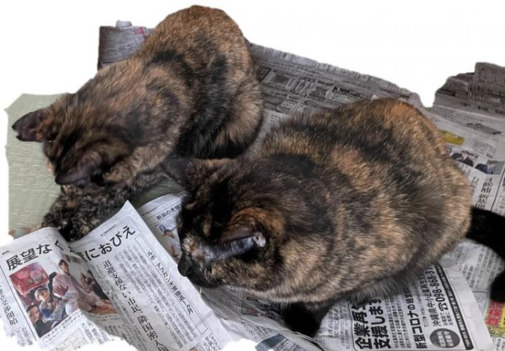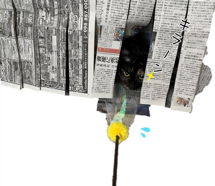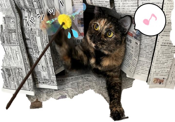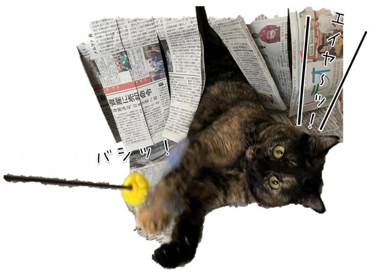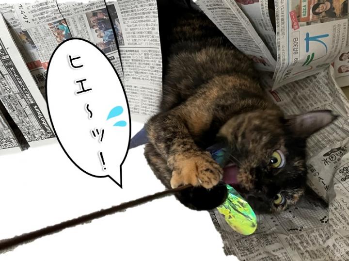 新聞紙のガサガサ!という音が好きなのか、おもちゃのないところにもスライディングしてくるという、