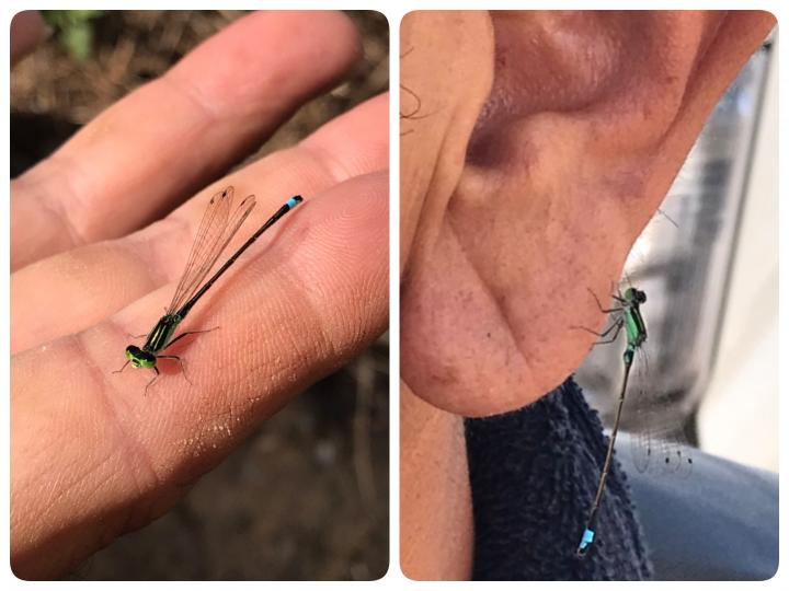 人懐こい小さなトンボが手にとまり、飛ばしたつもりがおいらの耳にイヤリング代わりにとまり直して友達を笑わせてました⁉️