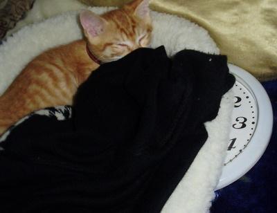 その中に子猫が眠れない時はチクタクと音のする時計を寝床の