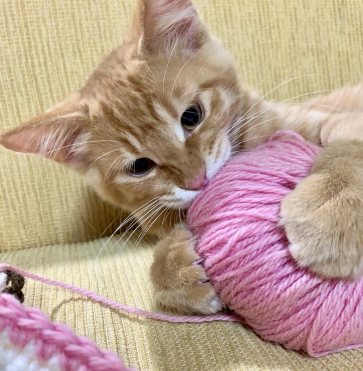 冬に向け、雅のお気に入りの枕のカバーを毛糸で編んであげようと思ったけど、邪魔する邪魔する😂ちっとも進みやしないʅ(๑ ᷄ω ᷅ )ʃ