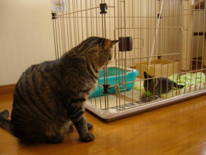もちろん新入りちゃんはケージに隔離してお見合いをしています。