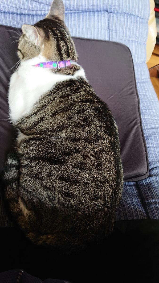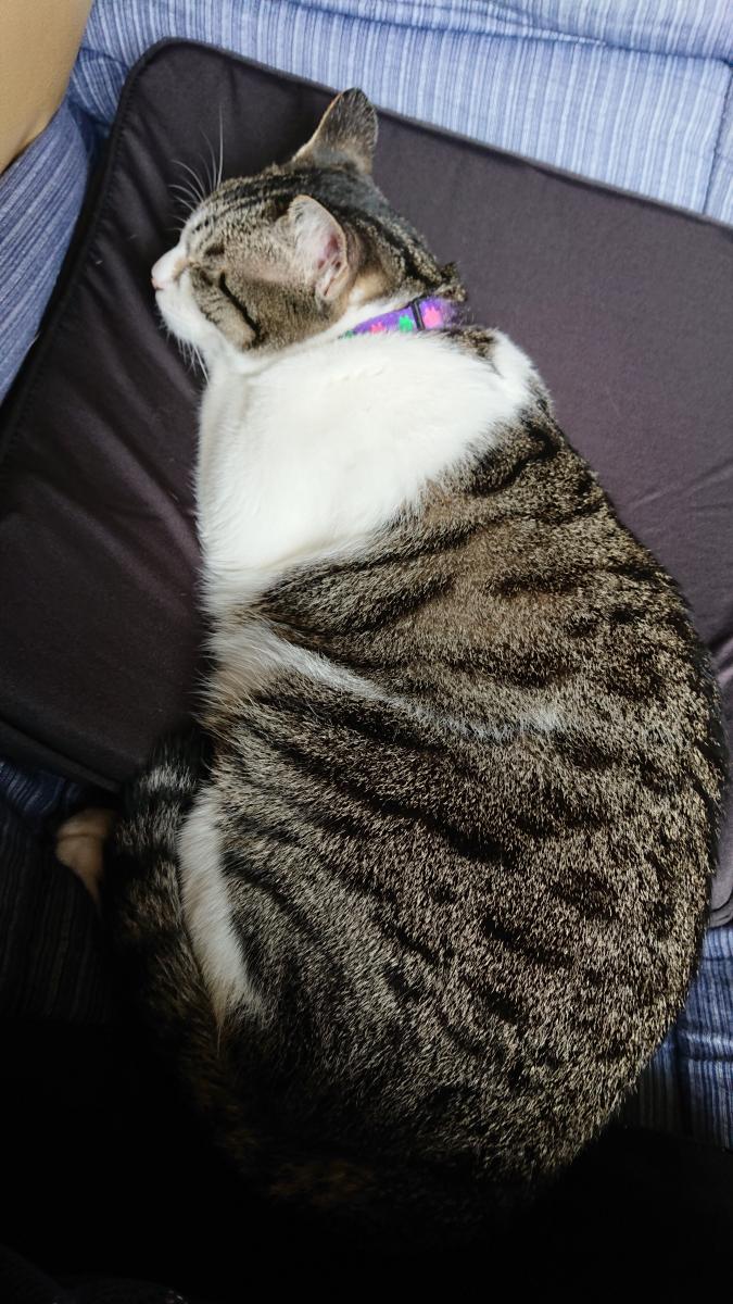 ミツジロウはんの隣で専用のクッションの上で一休みするリンちゃんでした。