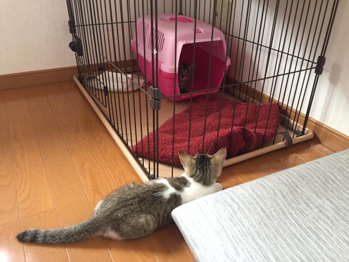 血液検査が終わり、先住猫さんたちとまずはケージ越しに対面