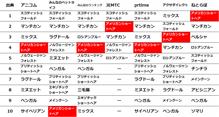 スコティッシュフォールドとマンチカンが圧倒的な強さですね。