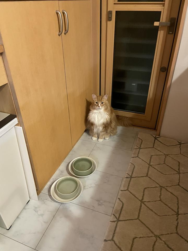 いつもこの場所でキチンと座って「おい。メシ!」とばかりに一声あげると人間が嬉しそうにご飯を運ぶのだ。