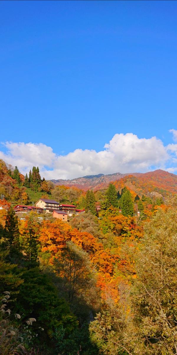 ぐんぐん山を登ると小谷温泉が見えてきます。写真中央に見える建物です。