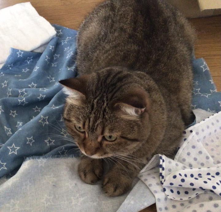 走り回るだけじゃなくて、ご主人のハンドメイドのお手伝い(という名の邪魔)をするのも大好きにゃ。