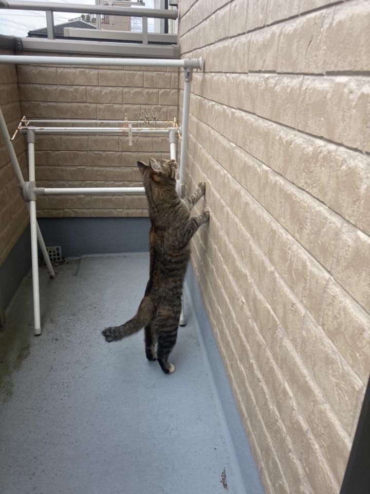 洗濯物を干すためにベランダへ。はなはベランダ探検も大好きです。