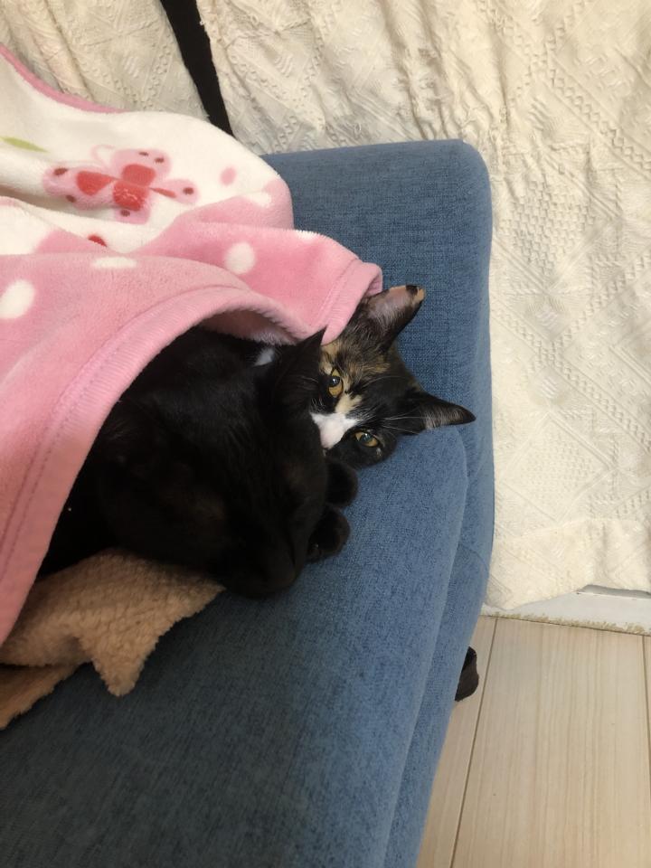 ↑寒くなったので娘愛用の毛布を二匹にあげたらしい