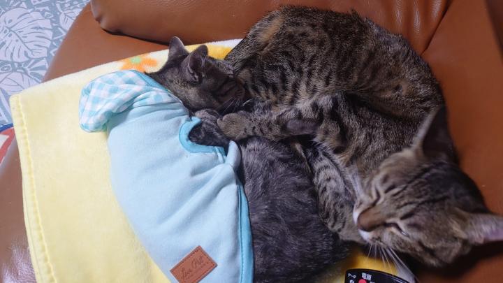 見た目は親子か姉弟かと思うほど同じ柄。笑(こてつは少し白っぽいキジとらですが)