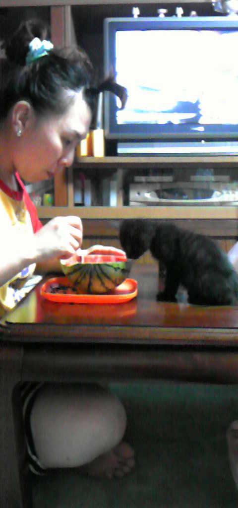そして、先日私の誕生日にダ~様がスイカを買って来てくれたので半分に切って贅沢食いしてました。