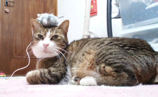 さて、物語中で活躍するチップですが、実は猫じゃらしのネズミを頭に載せられても動じないおっとりさんです。