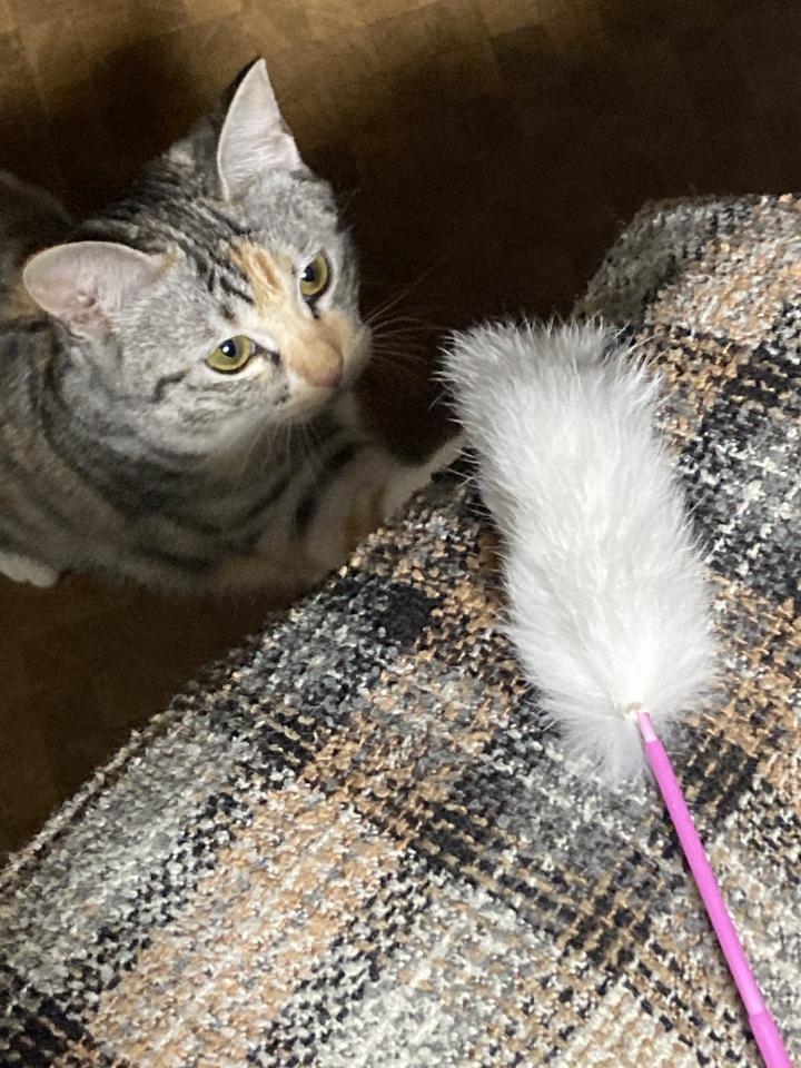 でも、人がいる時間はまだまだ育ち盛りなので、猫じゃらしや紐で遊んで貰うの大好き。