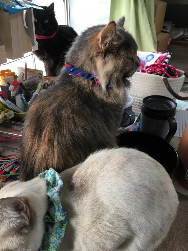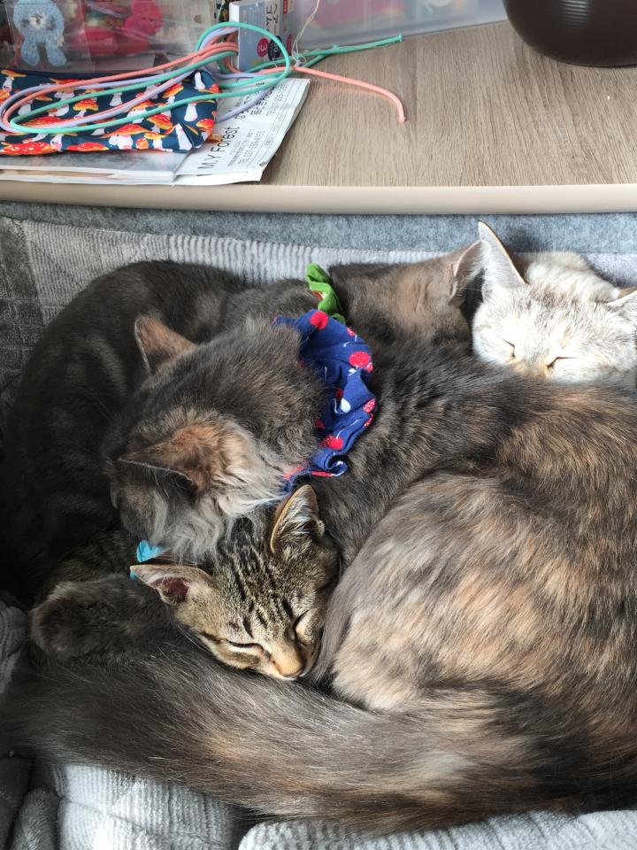 朝から猫まみれ。テーブルに手が届かん。あなた方、どうせ寝るんならママを起こさなくてよくね?