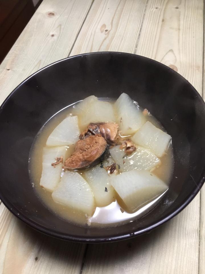 大根いただいたので、切ってチンして鯖缶と煮たのだけど、水煮が1缶しかなくて、今回は味噌煮缶!