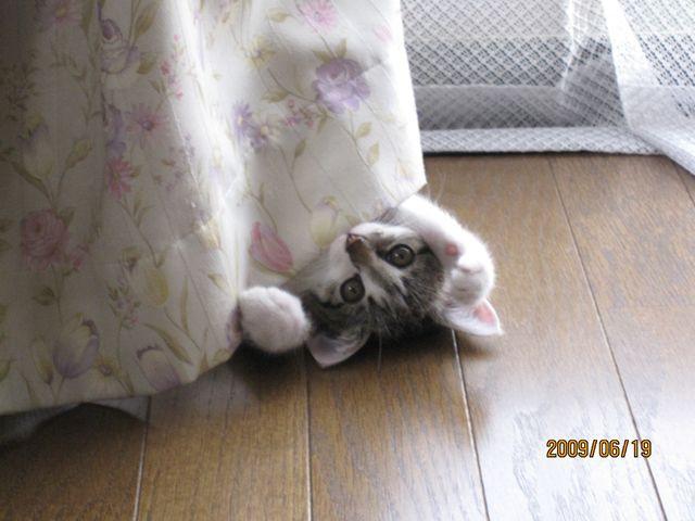 今では、少し助走をつけてカーテンに向かって走って行き、カーテンにしがみついて遊んだりしています(泣)