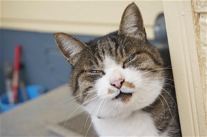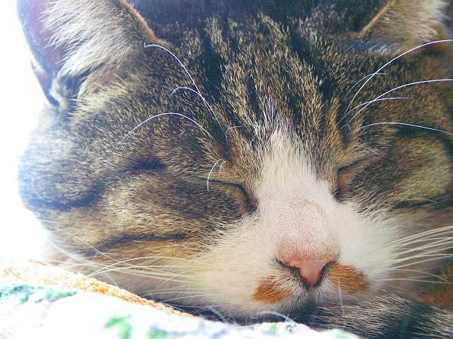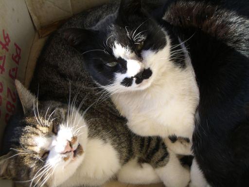 兄弟のマミヤ(右の黒白ちょび髭にゃんこ)と、一緒に物置の陽だまりで一緒におねんね中。